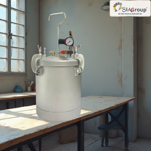 - Nồi trộn sơn: Là một bình chứa sơn chịu áp suất cao. Khí nén được bơm vào để tạo áp lực đẩy sơn đã được pha sẵn qua dây dẫn đến súng phun. Nhiều nồi trộn còn có cây khuấy tự động để đảm bảo sơn luôn đồng nhất.